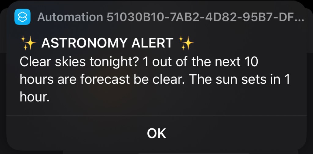 As an astronomer who enjoys coding, I had a go at using Apple Shortcuts to make my phone automatically check the weather one hour before sunset and notify me if the sky is forecast to be clear that night. Here’s how I did it.