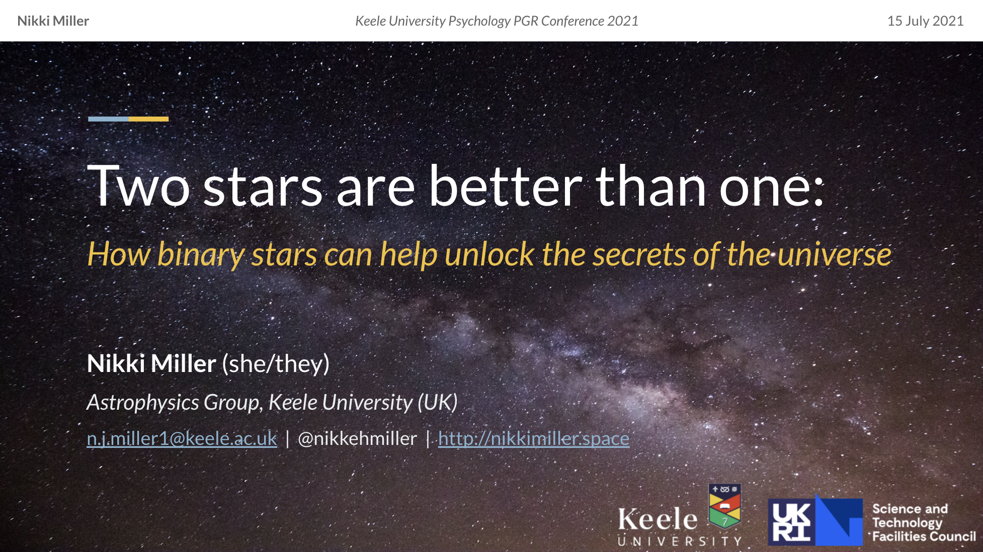 - “Two Stars Are Better Than One” – International Astronomical Youth Camp Seminar Series, Online (2021), Keynote at Keele University Psychology Postgraduate Research Conference, Online (2021)